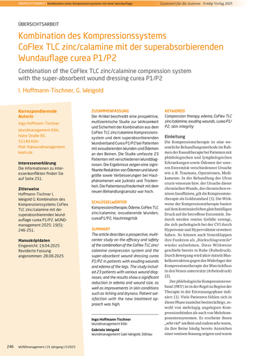 I. Hoffmann-Tischner, G. Weigold: Kombination des Kompressionssystems CoFlex TLC zinc/calamine mit der superabsorbierenden Wundauflage curea P1/P2. WUNDmanagement 2025(19); 5/2025;